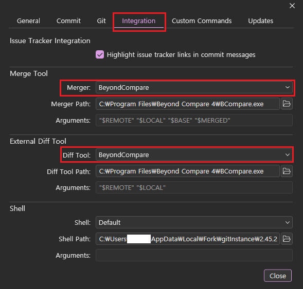 Intergration에서 Merge Tool / Diff Tool 에 원하는 프로그램을 설정